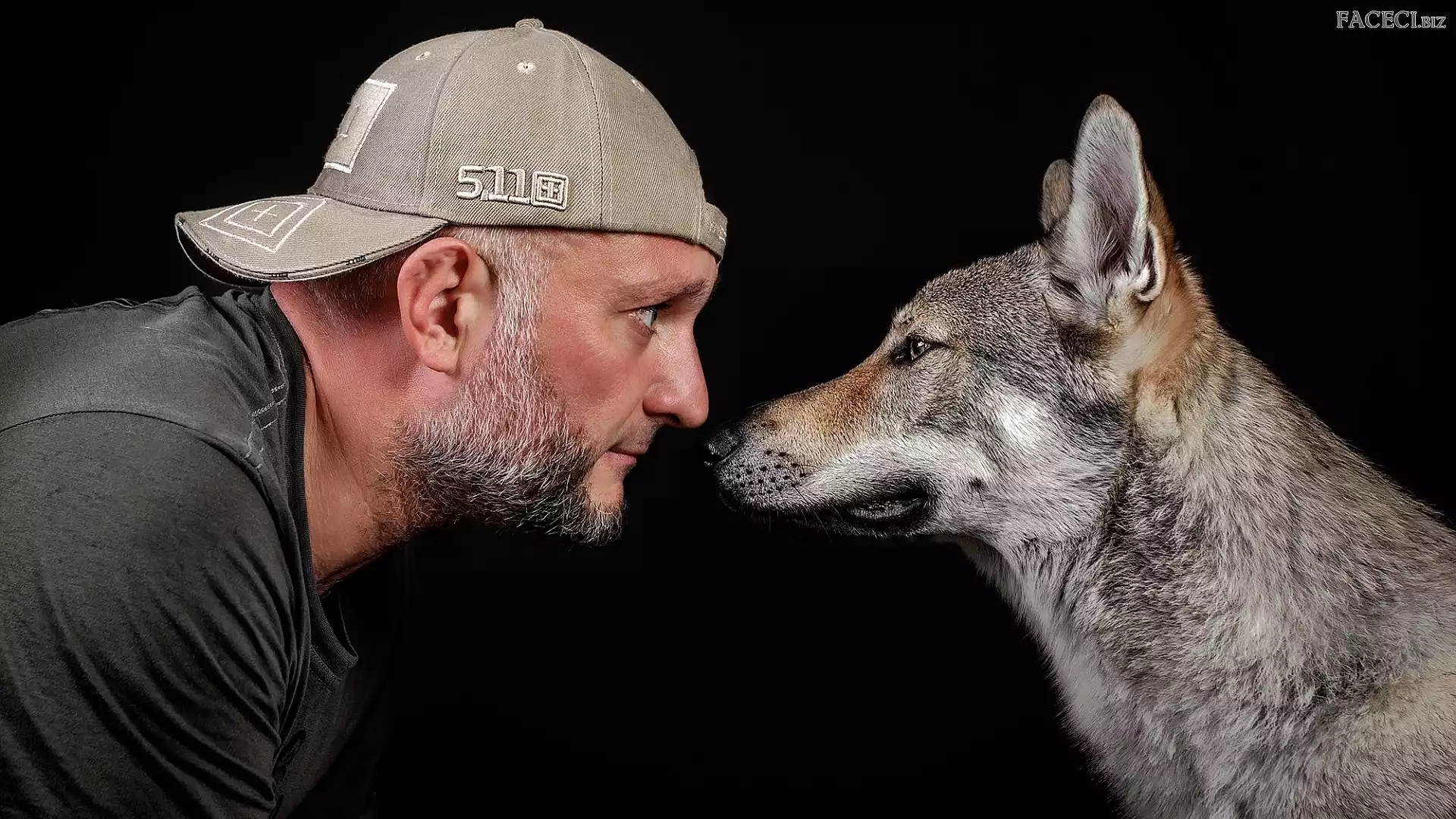 Pies, Tło, Wilczak czechosłowacki, Mężczyzna, Czarne, Profil, Broda, Czapka, Spojrzenie - faceci.biz |